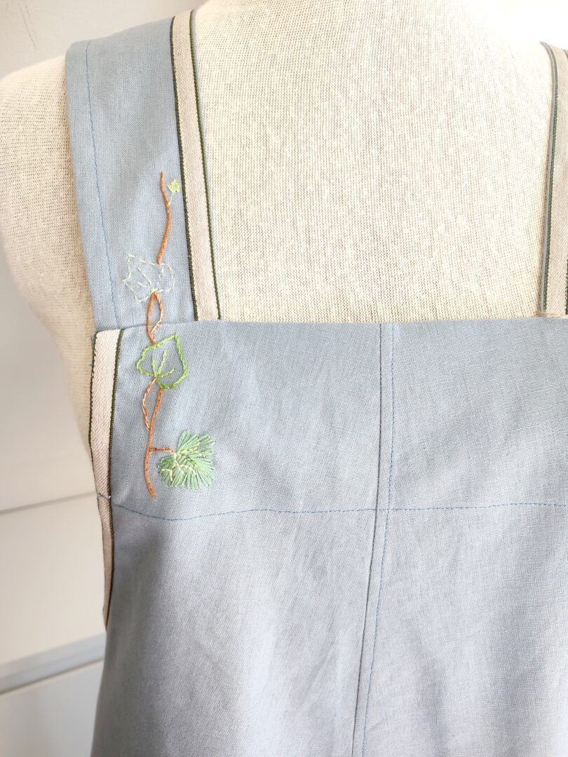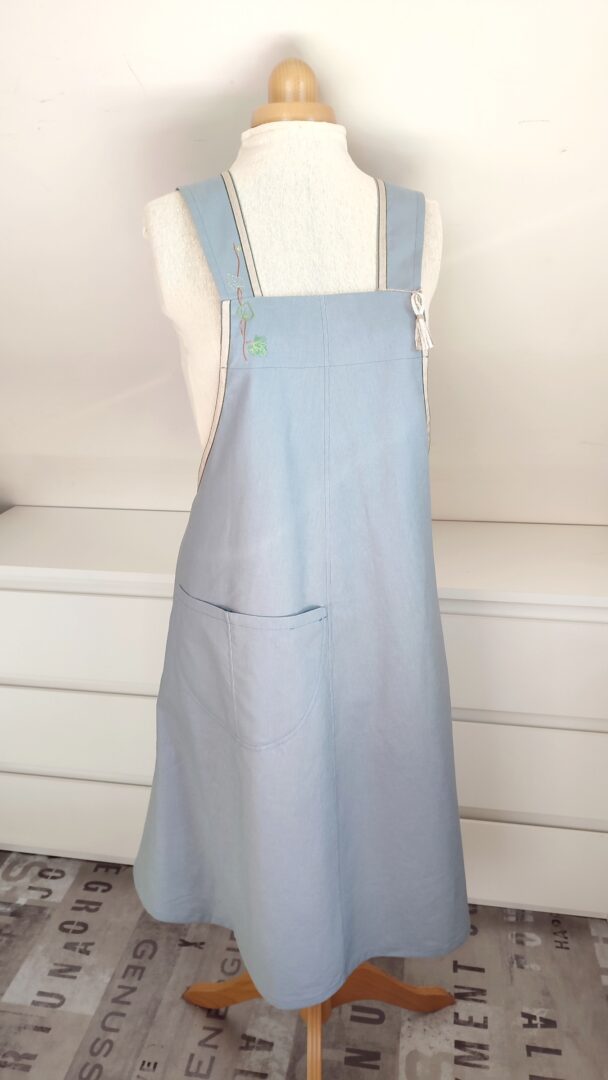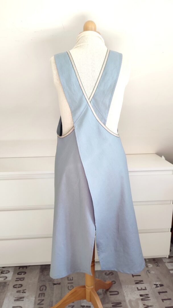 Bohème est une robe tablier en lin brut. Je l’ai imaginée dans l’esprit d’un tablier japonais. Les pans se croisent dans le dos et permettent d’enfiler le vêtement sans devoir l’attacher.
