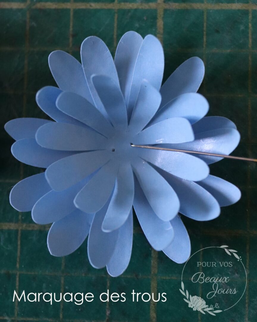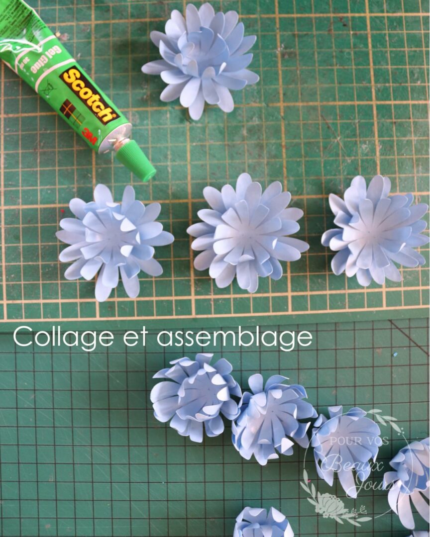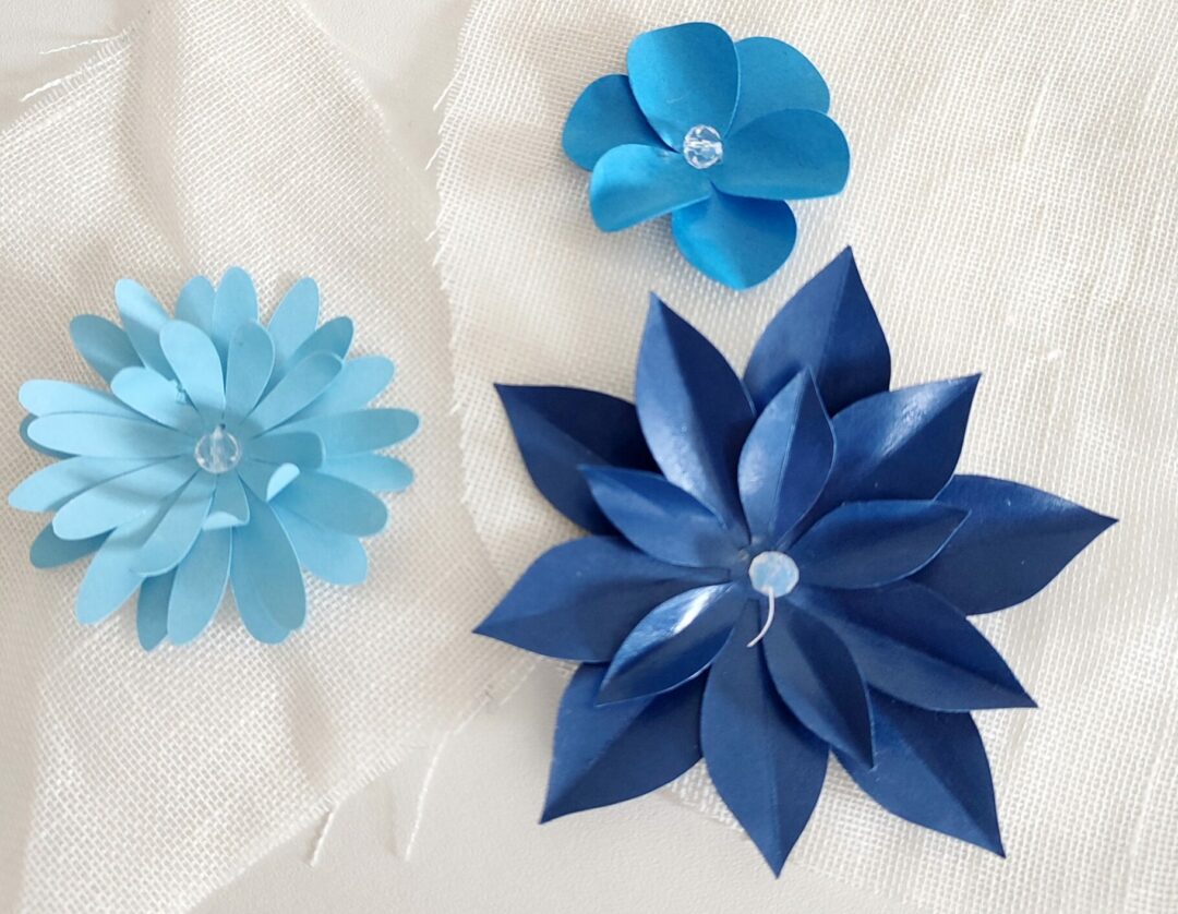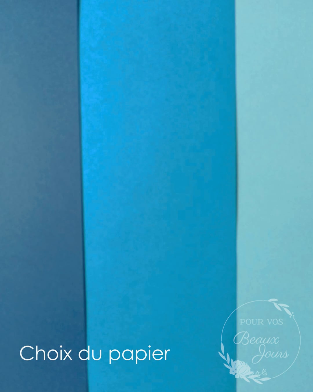 Angéline : Pour tout projet, je commence par choisir les différents papiers et définis la palette de couleurs. J’ai fait le choix du papier Canson-Vivaldi d’un grammage 120 g. Il se prête parfaitement au découpage, pliage et collage et a une large gamme de couleurs, même si je me suis arrêtée sur des nuances de bleu, couleur que j’affectionne particulièrement. Son moyen grammage a permis de réaliser des fleurs très légères qui n’ont pas impacté la tenue du voile de lin.