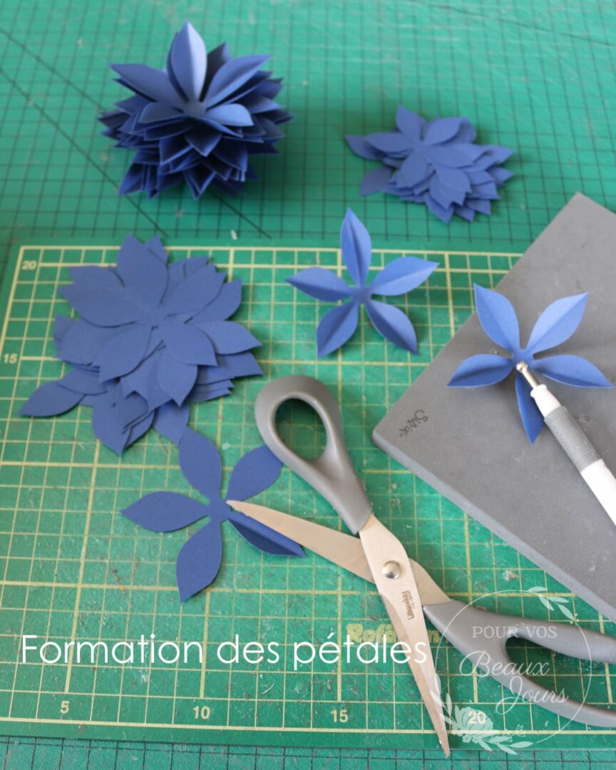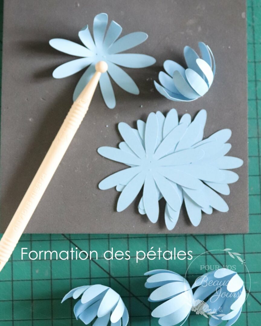Angéline : pour donner vie aux pétales, j’ai utilisé un stylet d’embossage et/ou plioir suivant le modèle de fleurs.