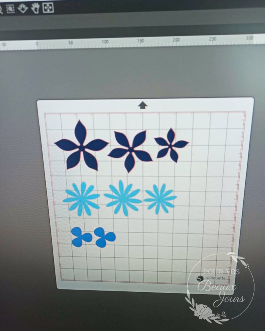 Angéline : les différentes fleurs étant choisies, place au dessin des parties les composant sur le logiciel « Silhouette ». Pour une découpe nette et précise des différentes parties, j’ai utilisé la machine de découpe « Silhouette Cameo 5 ».